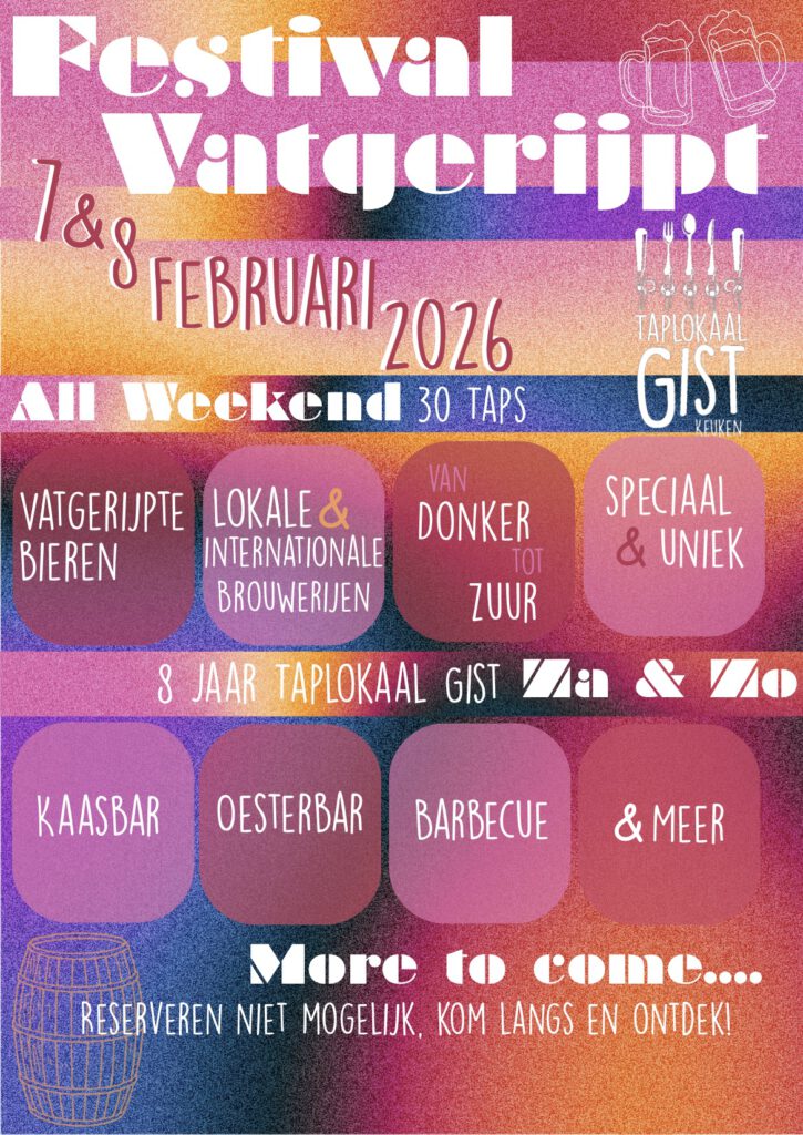 Dit doen we door een heel weekend lang superveel vatgerijpte bieren op tap te hebben. Natuurlijk vind je hier krachtige barrel aged (BA) stouts en barleywines tussen, maar ook zure bieren, farmhouse ales, IPA’s, tripels, ciders en saisons komen voorbij!